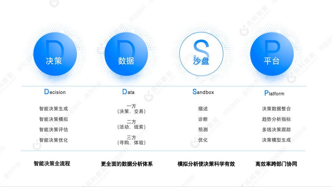黄金城集团智慧决策平台DDSP(Decision  Data Sandbox  Platform)从销售、市场、服务,以及智能制造等重要应用场景出发,从传统的专家决策方式向基于数据驱动的数智化决策进行全面升级。